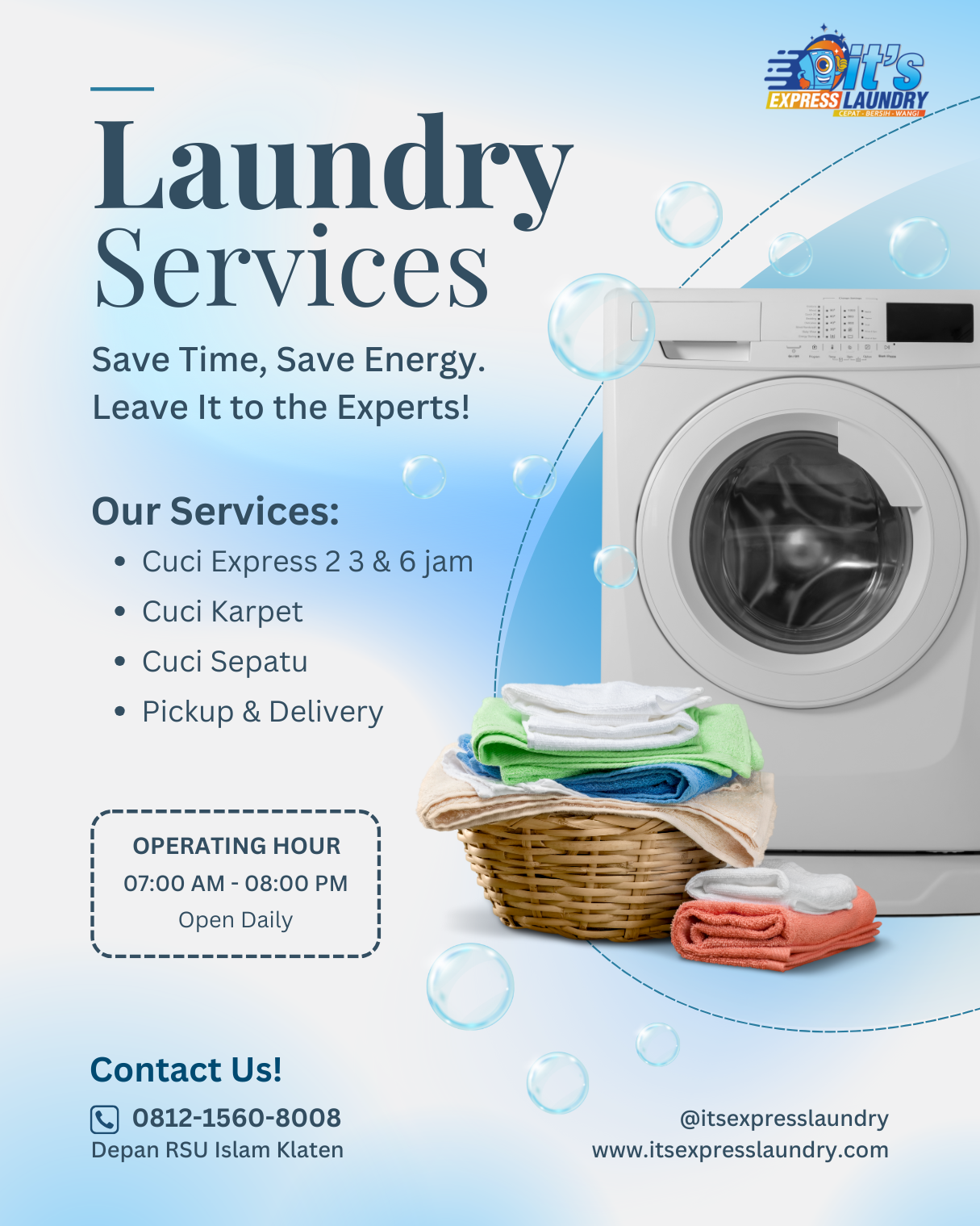 Nikmati layanan laundry ekspres di Klaten yang praktis dan berkualitas. Kunjungi It’s Express Laundry di depan RSU Islam Klaten atau hubungi kami untuk layanan antar-jemput.